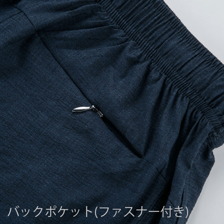 通気性の良い吸汗速乾の布帛生地を使ったショートパンツ。裾サイドスリット付きで、裾口は丸くラウンドしており脚長効果があります。 ヒップポケットはファスナー付きで、ランニングなどでも使い勝手がよくなっています。